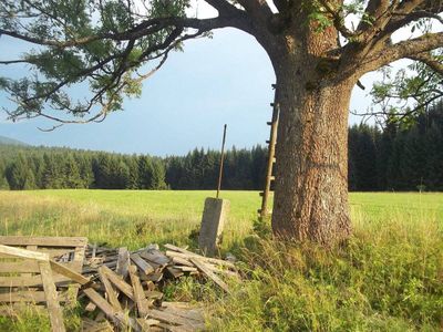 Kříž u stromu v polích u Závisti, pamětní kříž v obci Rybník, okres Domažlice