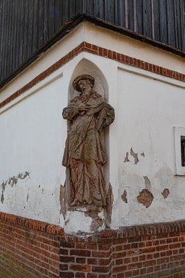 Socha svatého Jeronýma ve Vejvanovcích na stěně zvonice, statue in Vejvanovice, Czech Republic