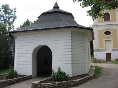 Kaplička nad studánkou poblíž poutního kostela ve středu Sudějova, kaplička v obci Sudějov, okres Kutná Hora