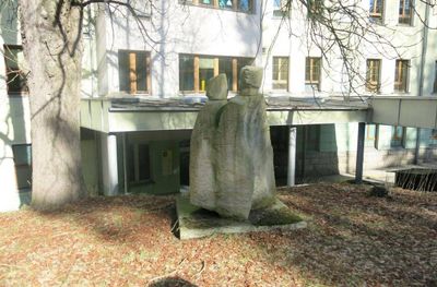 Kamenná plastika za budovou F2 nemocnice v Liberci