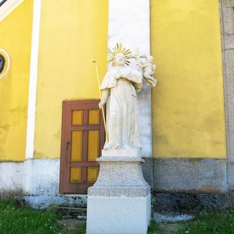 Socha světce vlevo na terase kostela Nanebevzetí v Chlumu u Třeboně
