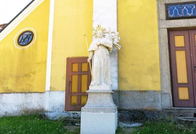 Socha světce vlevo u severního portálu kostela Nanebevzetí v Chlumu u Třeboně, statue in Chlum u Třeboně, Czech Republic
