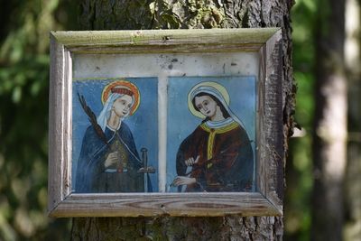 Obrázek na Kozí peci, rámeček s obrázky svatých u skalního útvaru Kozí pec v Plzni-Radčicích