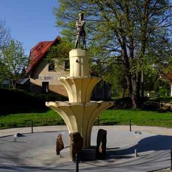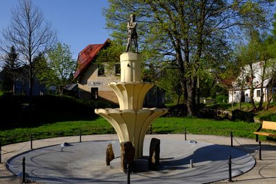 Kašna se sochou Siegfrieda v parku v Perninku, kašna v obci Pernink, okres Karlovy Vary