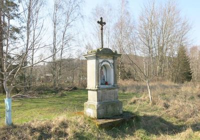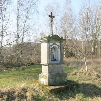 Kříž na podstavci s malbou svatého Václava ve výklenku, kříž v Rynolticích u ohybu cesty do Polesí poblíž domu čp. 163