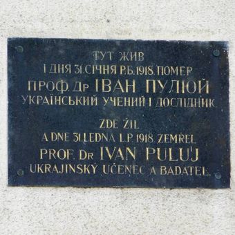 Commemorative plaque of Professor Ivan Puluj in Preslov Street in Prague