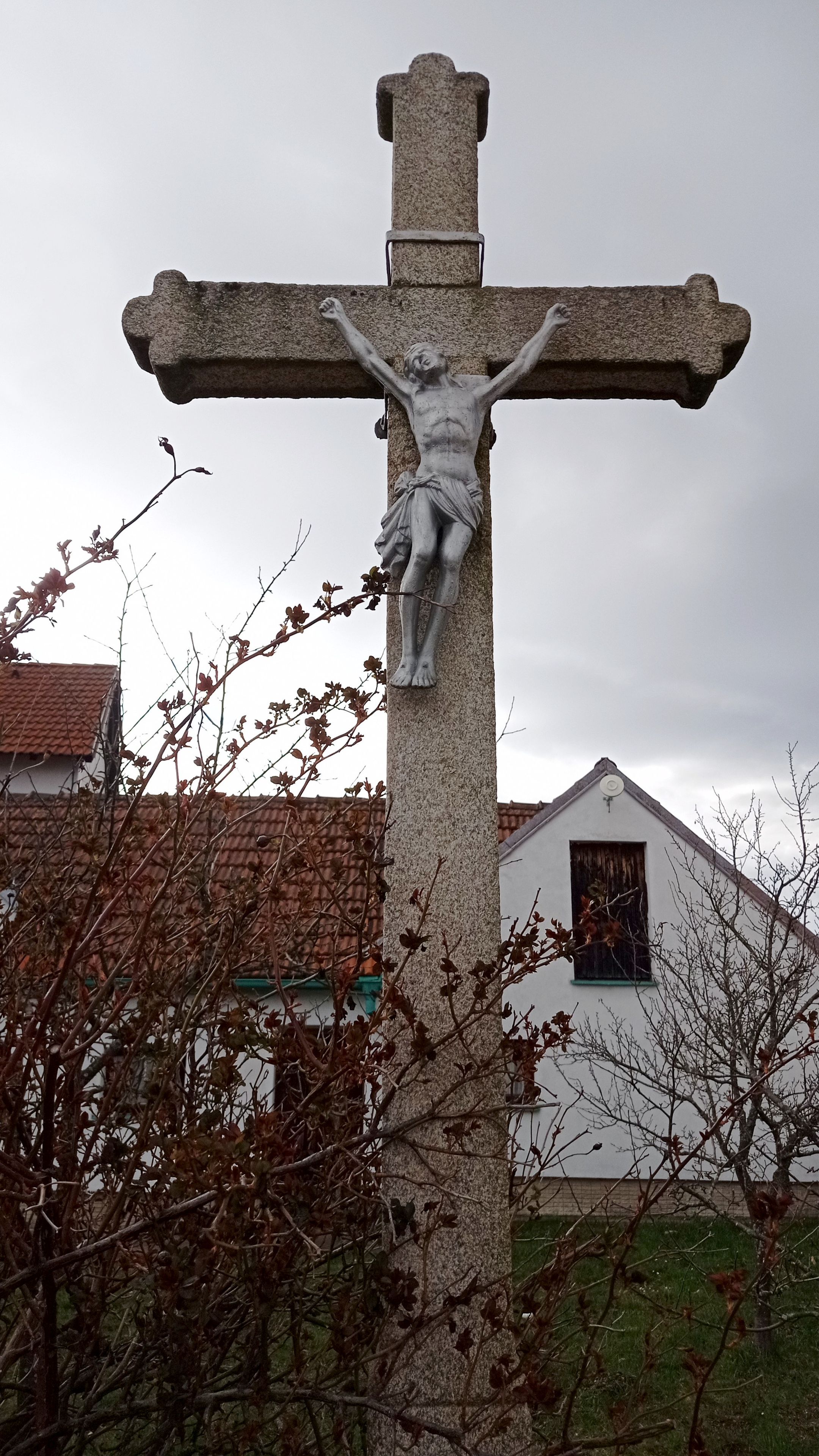 Wayside cross at the crossroads, religious monument at house No. 41 in Svatý Jan nad Malší, South Bohemian Region, Czechia