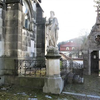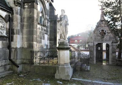 Socha svatého Pavla u kaple na hřbitově v Raspenavě, statue in Raspenava, Czech Republic