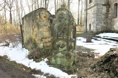 Podstavec kříže u vstupu do areálu kostela v Žibřidicích, pamětní kříž v obci Křižany v okrese Liberec