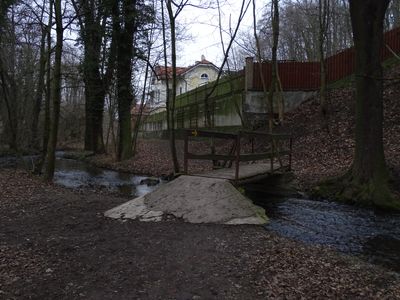 Lávka přes Únětický potok u rozcestníku Svojsíkovy sady