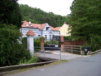 Mostek cesty k domu V Šáreckém údolí 106/33 přes pravé rameno Šáreckého potoka