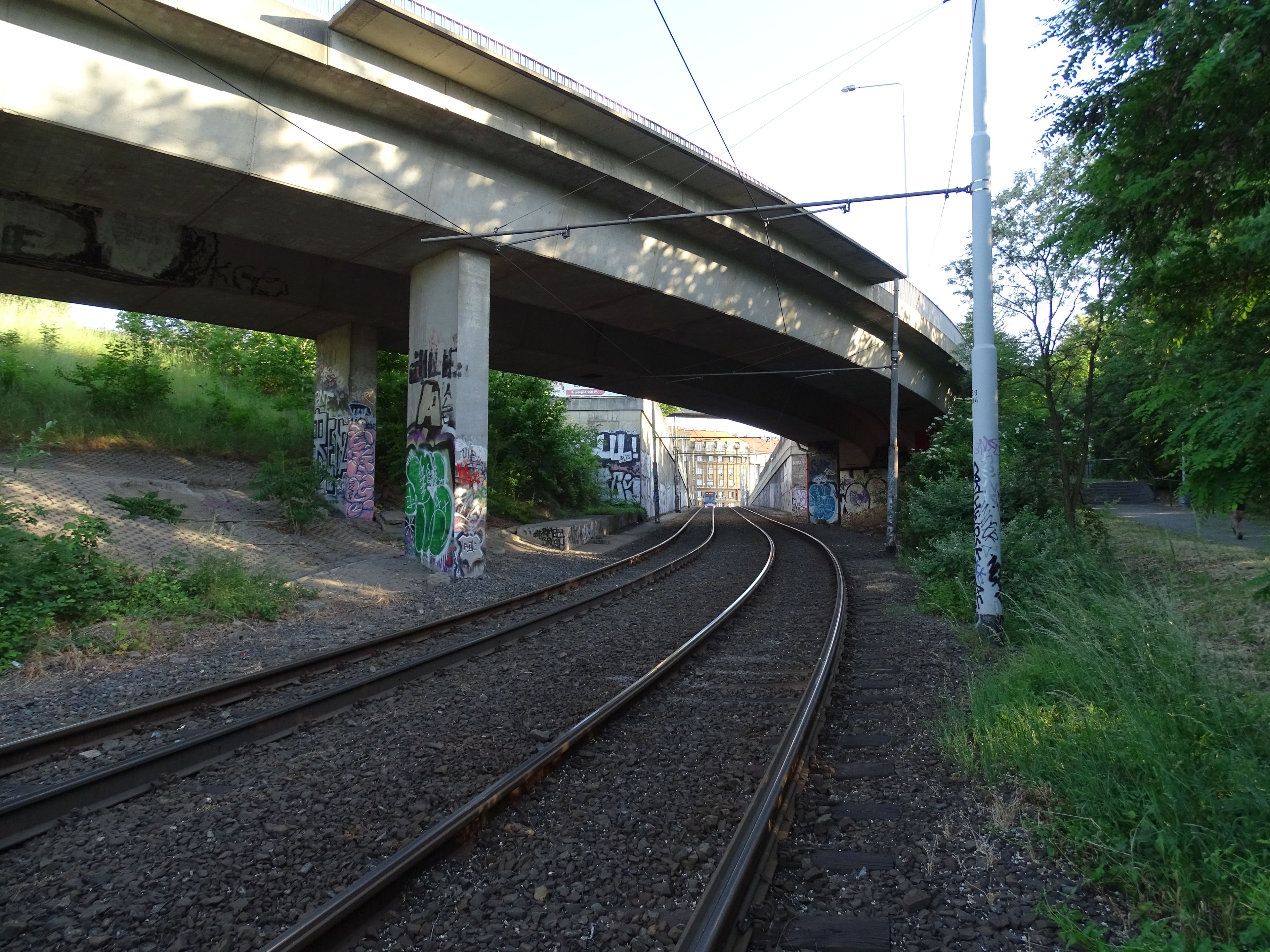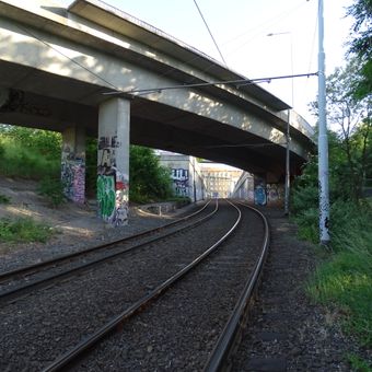 Bridge of Pod Krejcárkem street, most severozápadní větve ulice Pod Krejcárkem přes tramvajovou trať Ohrada - Palmovka u Ohrady