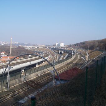 Most trati ze severního vítkovského tunelu v rozpletu Sluncová, železniční most v Praze-Žižkově
