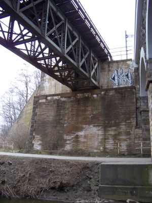 Bridge of railway line Praha-Libeň - Praha-Malešice near Hořejší rybník, železniční most přes Rokytku v Praze-Hloubětíně u hranice Hrdlořez