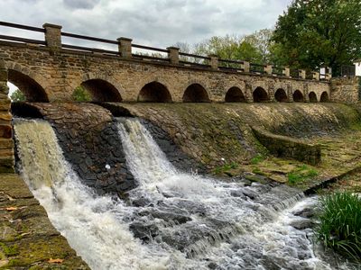 Můstek přes náhon Rokytky u hráze Počernického rybníka