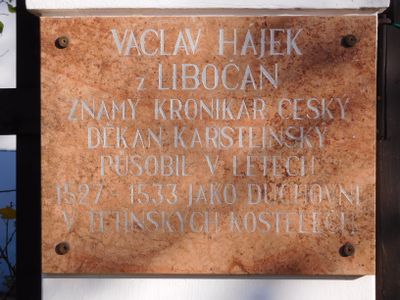 Plaque to Václav Hájek z Libočan at Tetín rectory, plaque in Beroun District