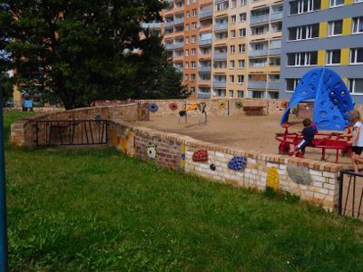 Mosaic wall of playground at Bronzová, mosaic in Prague