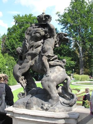 Socha lva vpravo od schodiště v Královské zahradě na Hradčanech, statue in Prague, Czech Republic