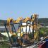 La montaña rusa invertida presenta rieles amarillos con soportes gris azulado, alcanzando alturas de 32 metros y velocidades de 80 kilómetros por hora.