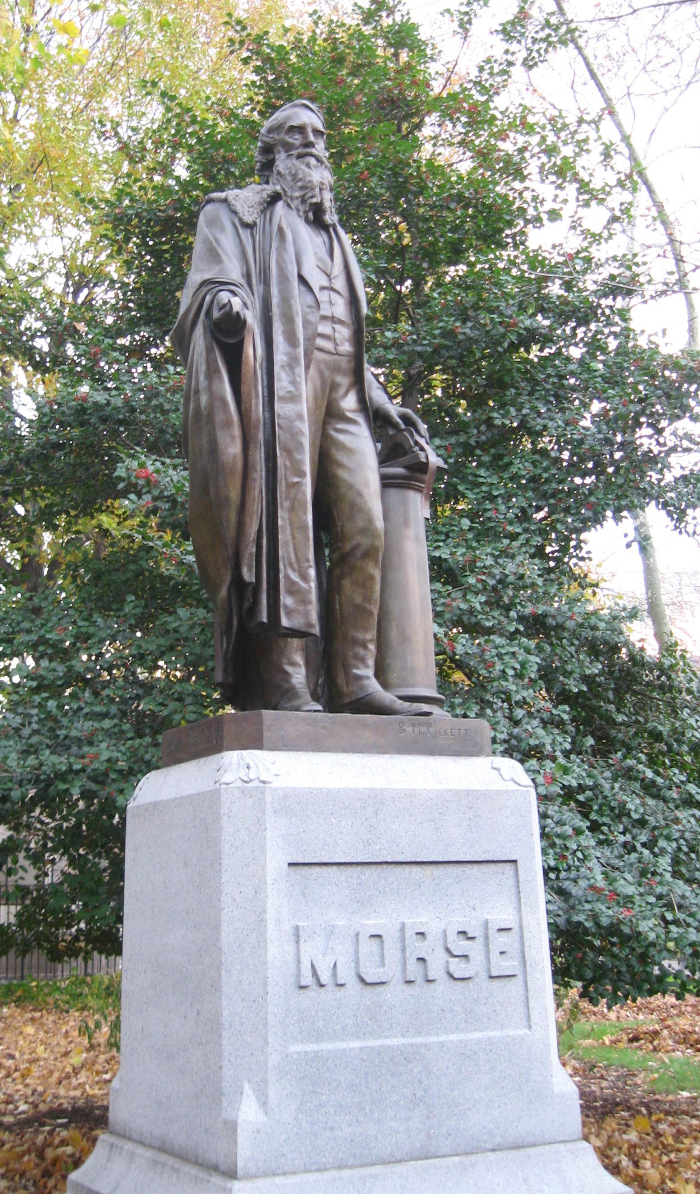 La escultura muestra a Morse sosteniendo una cinta de telégrafo, simbolizando su doble carrera como inventor y profesor de artes.