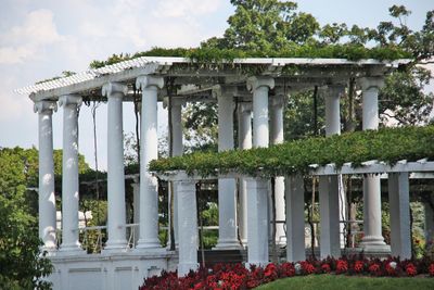 El anfiteatro de madera y piedra presenta una estructura tipo pérgola con un sendero elíptico de piedra rodeado de columnas de ladrillo y capiteles de bronce.