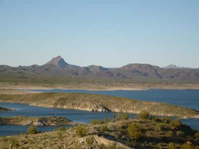 El Parque Estatal Lago Alamo incluye un gran embalse rodeado por el terreno del Desierto de Sonora con montañas y vistas al Pico Artillery.