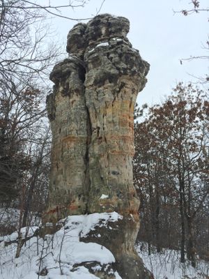 Una extensión de 31 hectáreas presenta un pilar de arenisca de 9 metros con una capa de piedra caliza, formado por la erosión del agua glacial.