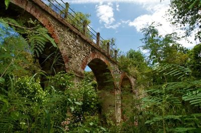 El Acueducto Alfonso XII se extiende 4 kilómetros por Ponce con múltiples arcos sostenidos por columnas de piedra y un canal semicircular.