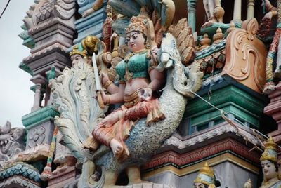 El Templo Sri Mahamariamman se eleva con un gopuram de 7.2 metros decorado con esculturas detalladas de deidades, soldados, diseños florales y cinco kalasams.