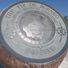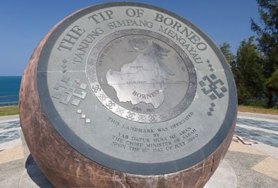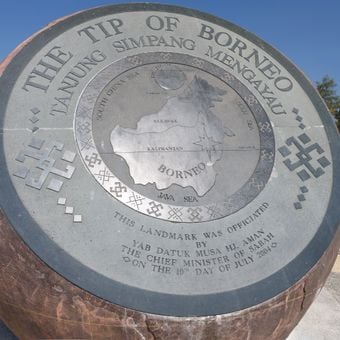 Un globo de bronce marca las coordenadas geográficas de esta ubicación, presentando un mapa de la isla de Borneo con inscripciones históricas.