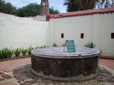 El pozo de piedra se encuentra dentro de muros de ladrillo macizo construidos a finales del siglo XVII, con elementos arquitectónicos chinos y malayos.
