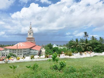 La basílica presenta una gran torre escalonada y alberga las reliquias de San Pedro Chanel en una capilla dedicada cerca del océano Pacífico.