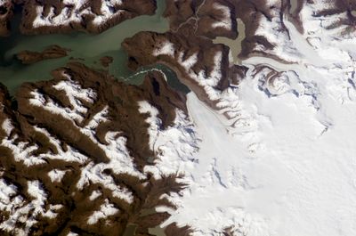 El glaciar fluye de sur a norte, depositando hielo en un fiordo que se extiende hacia el oeste en dirección al Océano Pacífico.