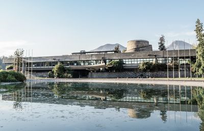 La sede incluye una piscina ovalada con fuentes de agua, jardines con cisnes y pavos reales, siguiendo los principios de Le Corbusier.