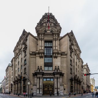 Esta estructura financiera presenta elementos arquitectónicos que reflejan el progreso económico de Perú durante la segunda mitad del siglo XX.