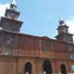 La catedral presenta una construcción que combina madera y cemento, con paredes interiores decoradas con bloques de material de concha compactada.
