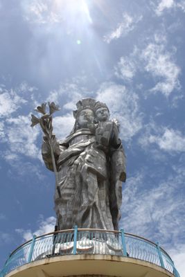 El monumento representa a la Virgen María sosteniendo al niño Jesús, funcionando como punto central para festivales y reuniones religiosas durante el año.