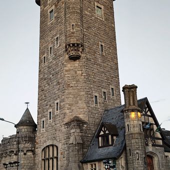 La torre de agua de estilo Tudor se eleva 88 metros sobre el nivel del mar, con un piso superior acristalado que ofrece vistas de Mar del Plata.