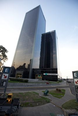 Torre Alem Plaza se eleva 32 pisos sobre el suelo con una fachada de cristal oscuro y pórticos dorados en sus puntos de acceso.