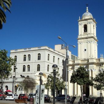 La Catedral Basílica se alza en el centro de San Salvador de Jujuy con sus paredes blancas y dos torres que dominan la entrada principal.