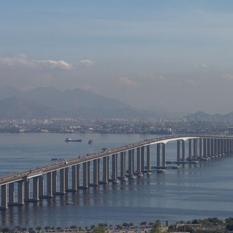 El puente Río-Niterói se extiende 13,3 kilómetros sobre la Bahía de Guanabara, con un tramo central de 300 metros y una altura de 72 metros.