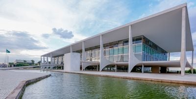 El Palacio del Planalto exhibe columnas de mármol blanco y estructuras de hormigón, situado en el borde norte de la Plaza de los Tres Poderes.