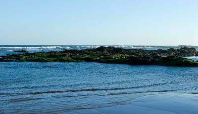 Durante la marea baja, la playa revela numerosas piscinas naturales entre formaciones rocosas, creando áreas protegidas para nadar.