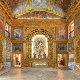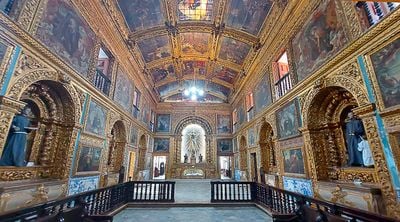 Esta capilla franciscana presenta un interior completamente revestido con láminas de oro aplicadas sobre relieves tallados en madera de cedro, creando un conjunto decorativo barroco de extraordinaria riqueza artística que refleja la prosperidad colonial del siglo XVIII.