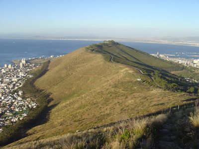 Signal Hill se eleva 350 metros sobre Ciudad del Cabo, conectando Kloof Nek con Lion's Head y ofreciendo vistas de la ciudad y el Océano Atlántico.