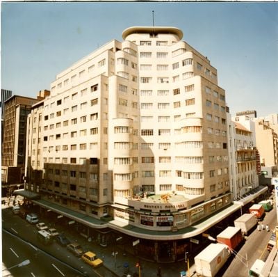 Manners Mansions cuenta con catorce pisos con esquinas curvas en la intersección de las calles Jeppe y Joubert en el distrito comercial.