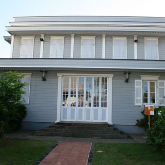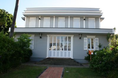 El edificio blanco de dos plantas exhibe arquitectura colonial francesa con ventanas altas, contraventanas de madera y barandillas ornamentadas.