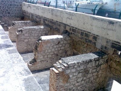 Los escalones de piedra en la entrada del puerto mantienen su estado original de 1860, marcando el primer punto de contacto para miles de trabajadores.