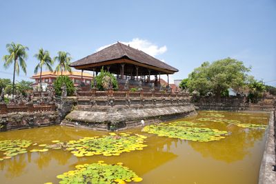 El Pabellón Kertha Gosa, parte del antiguo complejo palaciego, exhibe pinturas detalladas en el techo que ilustran procedimientos judiciales balineses tradicionales y narrativas mitológicas.