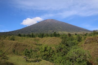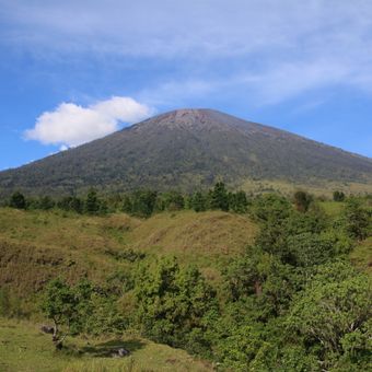 El Monte Rinjani se eleva 3.726 metros sobre el nivel del mar, con una gran caldera que contiene el lago Segara Anak a 2.000 metros de altura.